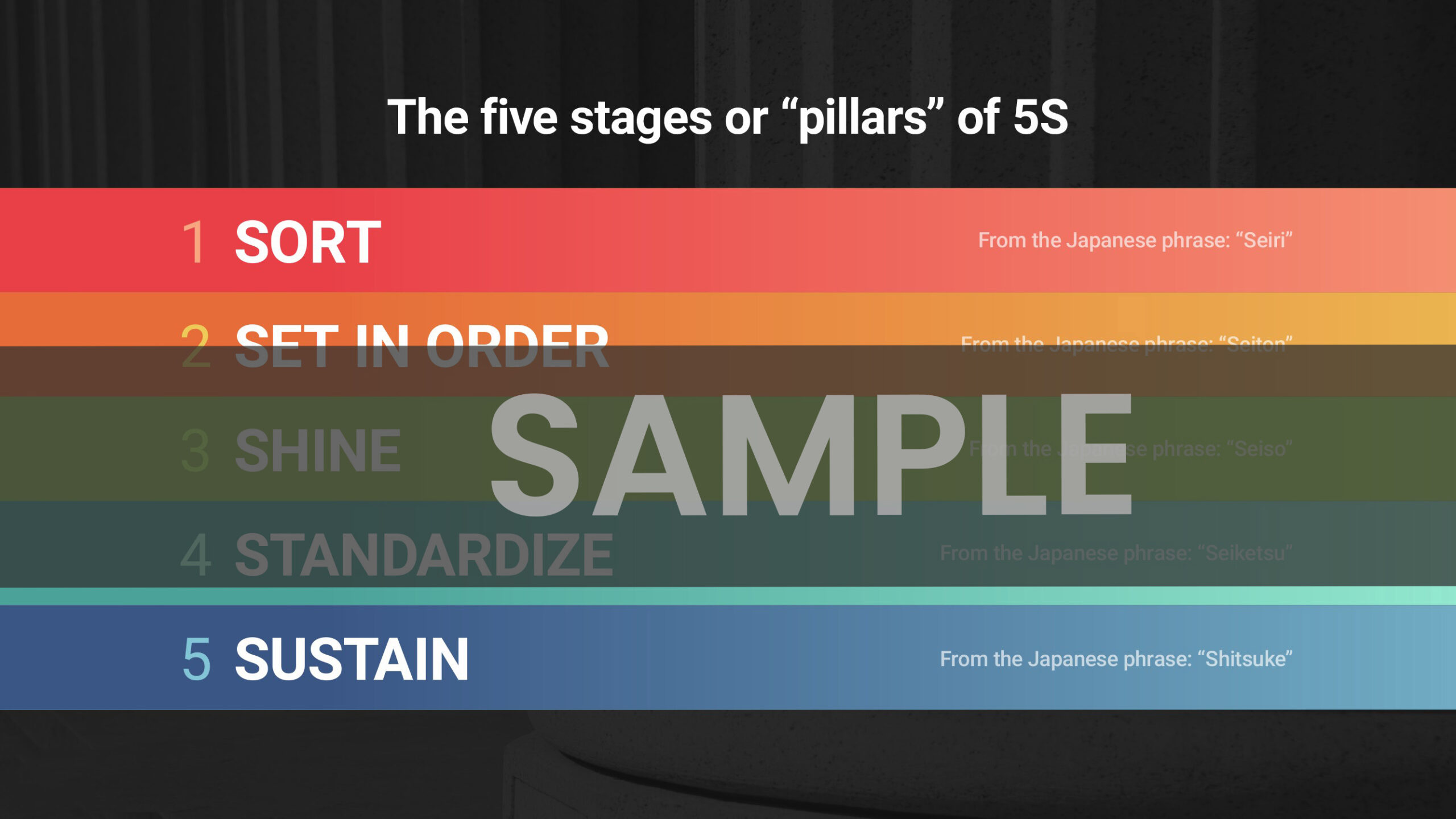 This PowerPoint presentation explains the fundamentals of the 5S methodology — Sort, Set in Order, Shine, Standardize, and Sustain. It outlines each step clearly and concisely, helping users understand the principles of workplace organization and improvement.